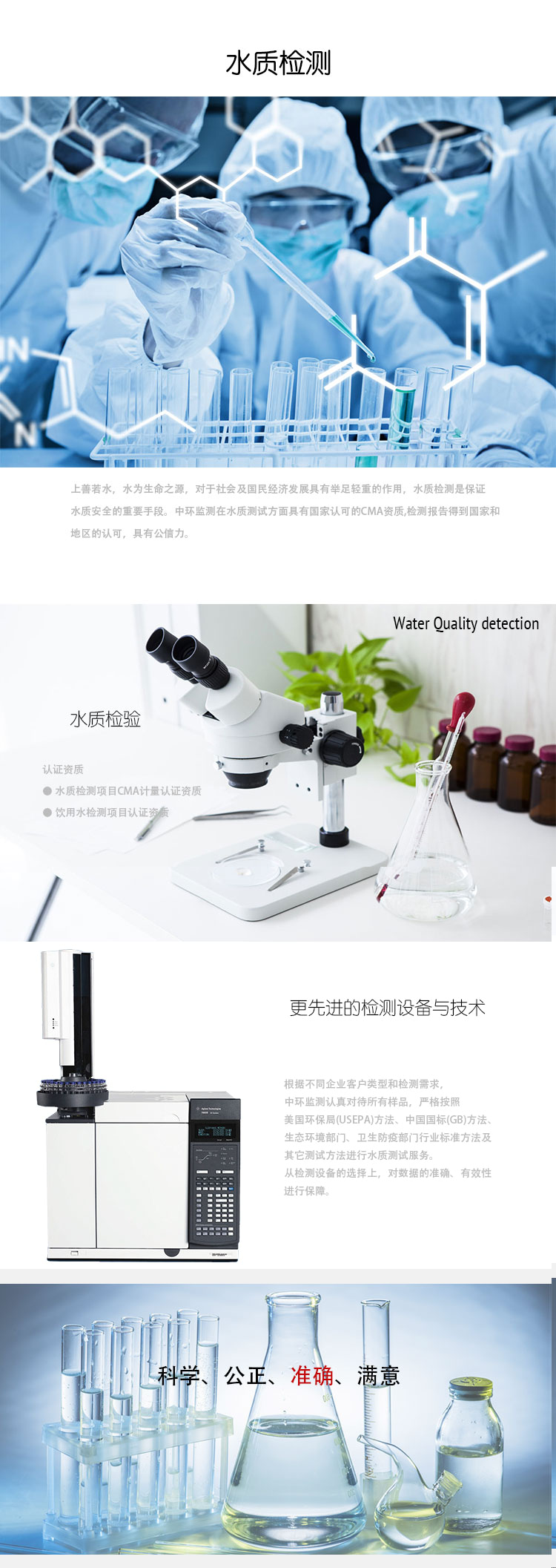 根據(jù)不同企業(yè)客戶類型和檢測需求,中環(huán)監(jiān)測認真對待所有樣品,嚴格按照美國環(huán)保局(USEPA)方法、中國國標(GB)方法、生態(tài)環(huán)境部門、衛(wèi)生防疫部門行業(yè)標準方法及其它測試方法進行水質(zhì)測試服務(wù)。如果您有關(guān)于水質(zhì)方面的檢測需求,歡迎與我們聯(lián)系。